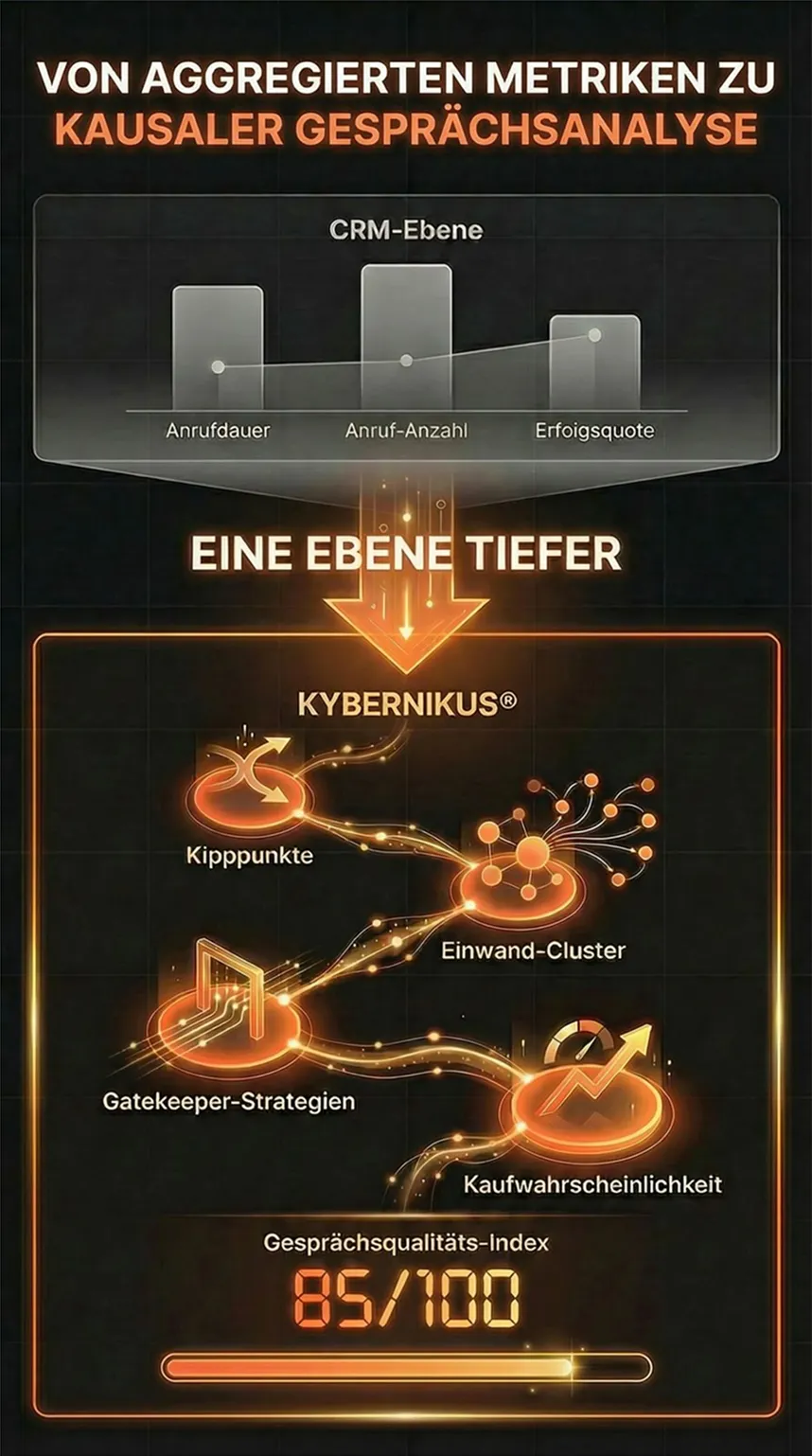 Herkömmliche CRM-Systeme wie HubSpot, Pipedrive oder Salesforce zeigen Ihnen vor allem Endergebnisse: Anzahl Calls, Anzahl Termine, Anzahl Abschlüsse. Sie sehen dass etwas passiert ist – aber nicht warum. KYBERNIKUS® geht einen Schritt tiefer und analysiert jede Gesprächssequenz auf Skript-Ebene: Wurde der Leitfaden vollständig durchlaufen? Welche Einwände traten auf und wie wirksam wurden sie behandelt? An welcher Stelle sprang das Interesse des Kunden sichtbar an, wann brach es ab? Daraus errechnet der Gesprächsqualitäts-Index einen klaren Score pro Call und pro Kampagne. Führungskräfte erkennen damit nicht nur „mehr oder weniger Output“, sondern exakt, an welchen Dialogstellen sie nachschärfen müssen – etwas, das ein klassisches CRM ohne KI-gestützte Transkript- und Musteranalyse schlicht nicht leisten kann.